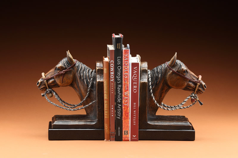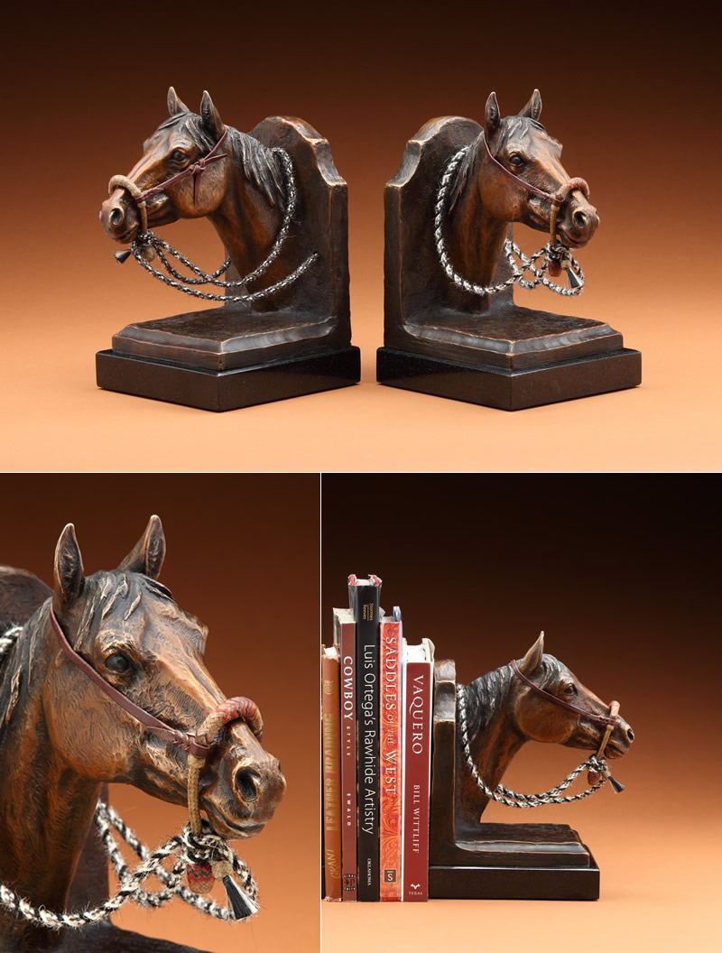 The bookends are a limited edition of 40. Bronze horsehead sculpture by Jim Gilmore, rawhide hackamore rig by Leland Hensley, horsehair mecate by Douglas Krause. $4,500 per set. Hackamores for each set are handmade one at a time so delivery will be 4-6 weeks.
